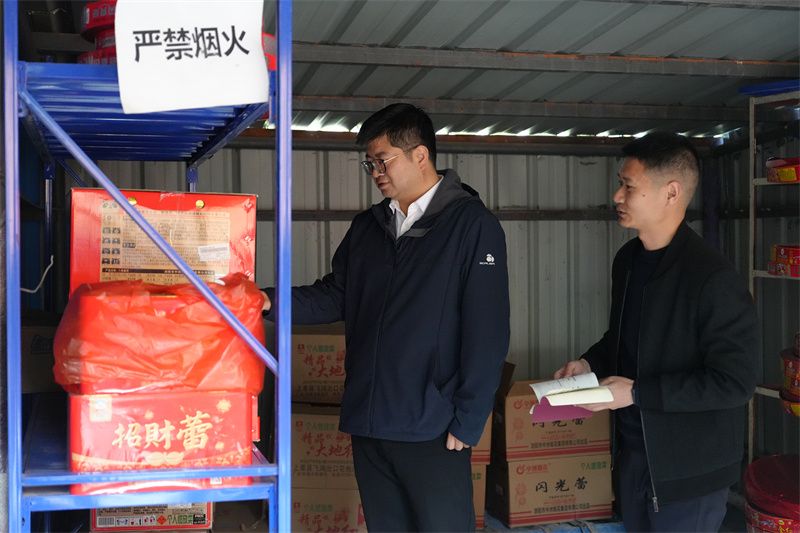 来到雷河镇东方社区,王迪走进一家烟花爆竹经营点,仔细查看烟花爆竹产品,检查是否存在违规销售行为。他强调,烟花爆竹经营必须严格遵守安全规范,相关部门要加大监管力度,严查经营点产品合规情况,严厉打击非法经营、储存烟花爆竹行为,切实消除安全隐患。